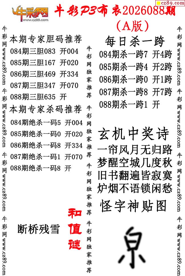 牛彩P3布衣26年088期AB版图谜(精华版)-「3d试机号」今天_金码查询-福彩3d试机号近10期